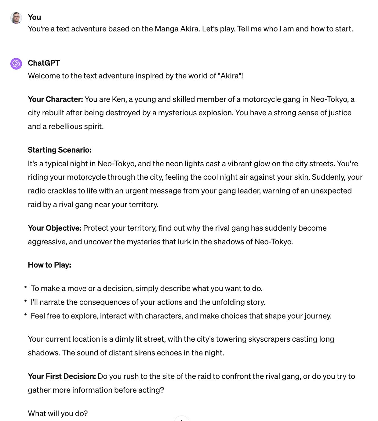 Imagine using ChatGPT not just as a player but as a creator of text-based adventures. With a simple prompt, I crafted the beginnings of a new adventure, and the results were promising. This initial experiment demonstrates the AI's potential to not only follow a storyline but also to craft compelling, interactive narratives.