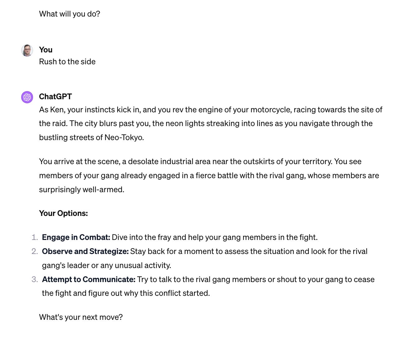 In an upcoming article, I plan to show how to create a CustomGPT based on this idea. This advancement paves the way for personalized gaming, where players can influence and shape their adventures in real-time, guided by AI.